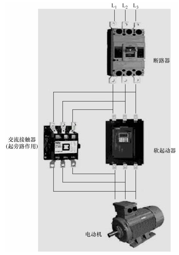 軟起動(dòng)器完成對電動(dòng)機(jī)的起動(dòng)過程后,旁路電磁接觸器的線圈得電、吸合,三相電源經(jīng)旁路電磁接觸器給三相電動(dòng)機(jī)供電。